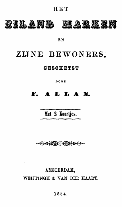 Het moge waar zijn, dat het Eiland Marken, bij velen in ons Vaderland bekend zij, zoo wel door de natuurlijke gesteldheid van dit stukje gronds, als door de eigenaardige, of liever, verouderde gewoonten van zijne bewoners;—niet minder waar is het, dat dit Eiland, bij nog meerdere onzer Landgenooten, zoo niet geheel onbekend, minstens niet goed, niet naar waarheid, bekend zal zijn.—